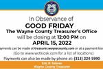 The Wayne County Treasurer's Office will offer extended hours this Wednesday and Thursday. On Wednesday, March 30, 2022, the office will be open until 6:30 p.m., and on Thursday, March 31, 2022, the office will be open until 8 p.m.